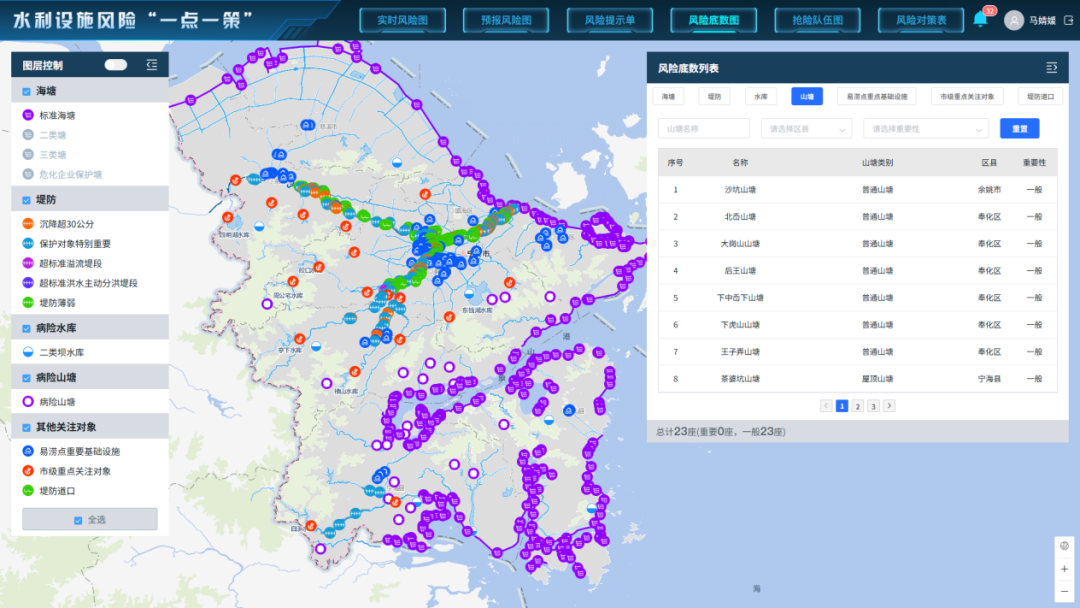 防汛抗洪,首先要摸清風(fēng)險(xiǎn)底數(shù)。每年汛前,該系統(tǒng)定期維護(hù)水庫(kù)、山塘、堤防、海塘等水利設(shè)施及搶險(xiǎn)救援信息,為風(fēng)險(xiǎn)預(yù)報(bào)預(yù)警提供基礎(chǔ)底數(shù)。調(diào)用水利設(shè)施風(fēng)險(xiǎn)研判模型,通過(guò)實(shí)時(shí)研判和創(chuàng)建預(yù)報(bào)方案計(jì)算,展示可能產(chǎn)生風(fēng)險(xiǎn)的水利設(shè)施、風(fēng)險(xiǎn)等級(jí)及相應(yīng)對(duì)策措施,形成風(fēng)險(xiǎn)提示單和預(yù)報(bào)風(fēng)險(xiǎn)圖,為搶險(xiǎn)救援提供精準(zhǔn)支撐。