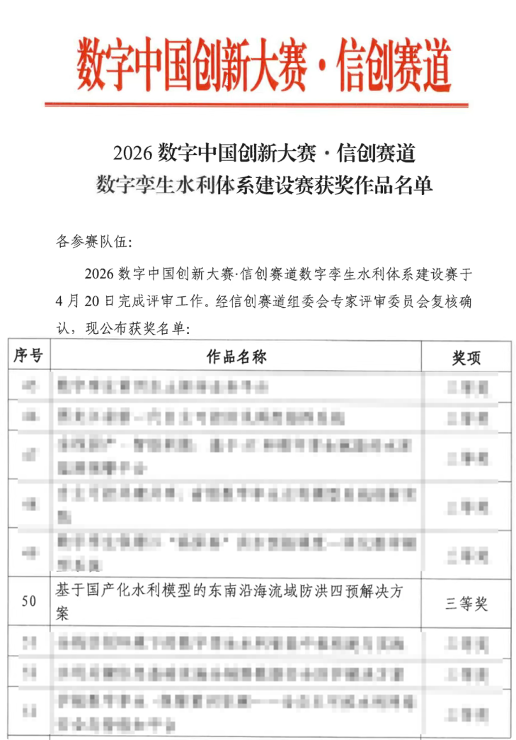 近日,“2026數(shù)字中國(guó)創(chuàng)新大賽·信創(chuàng)賽道數(shù)字孿生水利體系建設(shè)賽獲獎(jiǎng)作品名單”正式公布,我院與寧波市水文與數(shù)據(jù)中心、河海大學(xué)聯(lián)合申報(bào)的“基于國(guó)產(chǎn)化水利模型的東南沿海流域防洪四預(yù)解決方案”榮獲2026數(shù)字中國(guó)創(chuàng)新大賽·信創(chuàng)賽道數(shù)字孿生水利體系建設(shè)賽三等獎(jiǎng)!