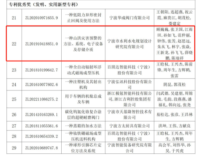 近日,寧波市市場監(jiān)督管理局公布了第三屆寧波市專利創(chuàng)新大賽獲獎項目名單,我院提交參賽的發(fā)明專利“一種山洪災害預警的方法、系統(tǒng)、電子設備及存儲介質”榜上有名,獲得本次大賽的“專利優(yōu)秀獎(發(fā)明、實用新型專利)”。